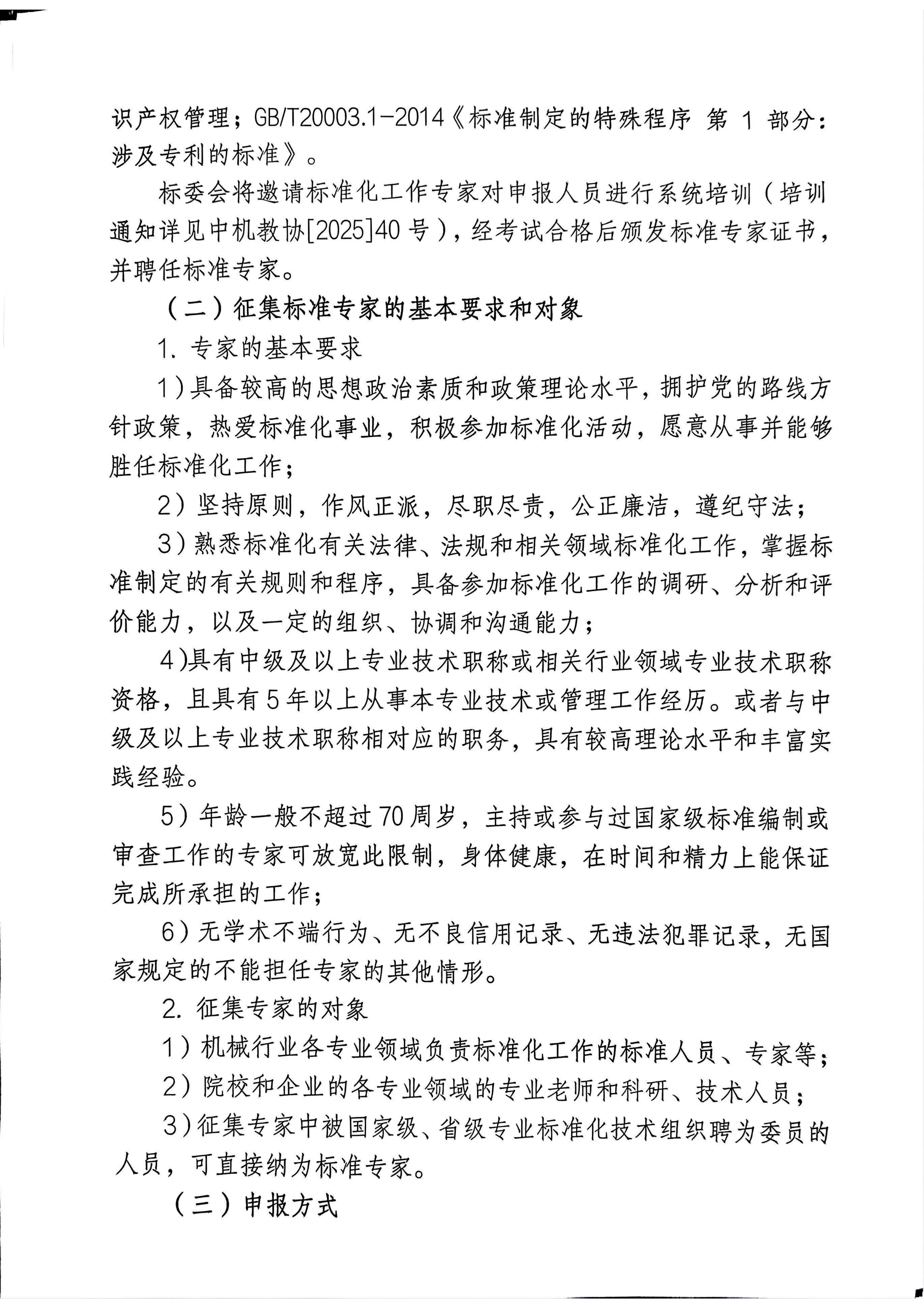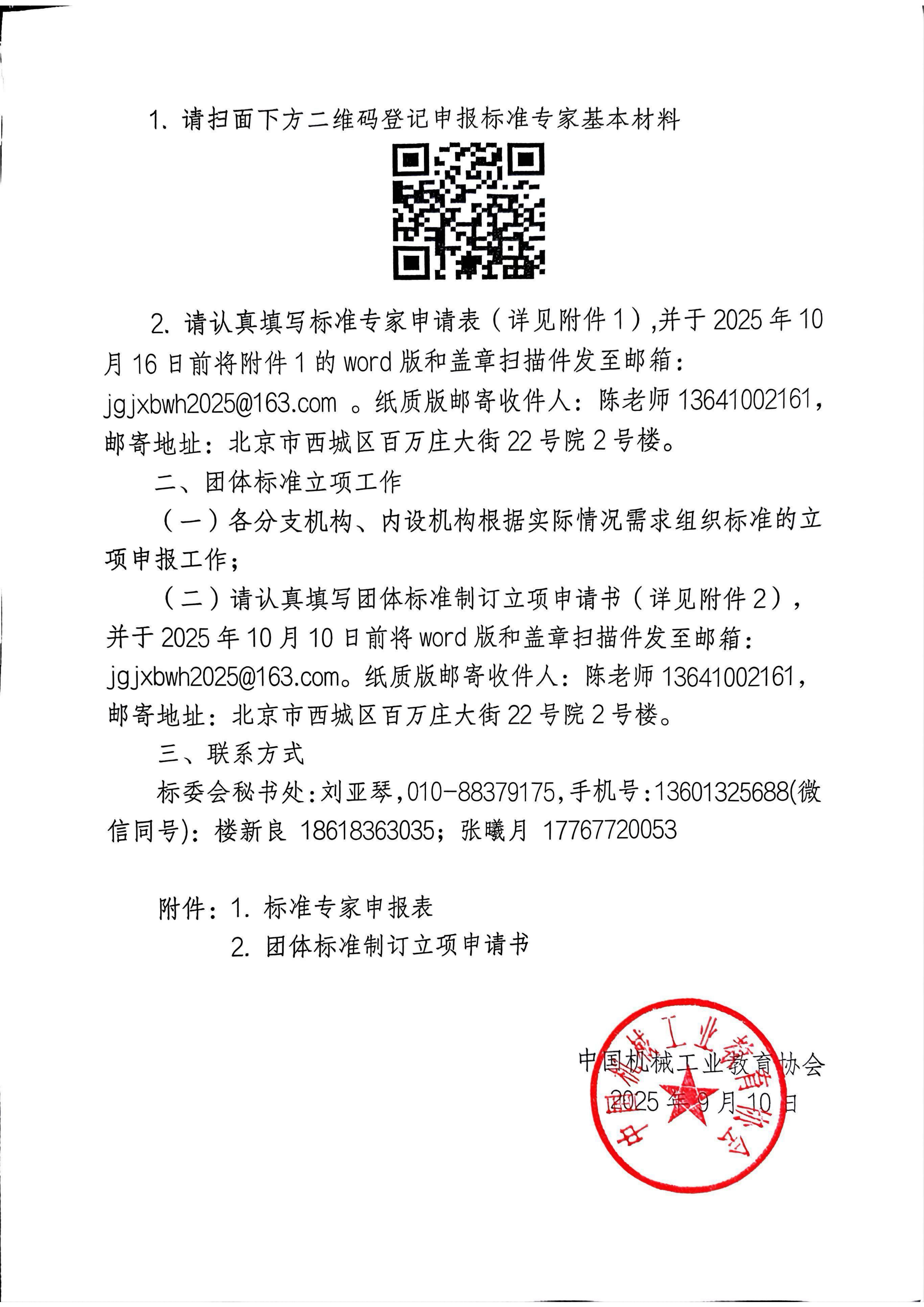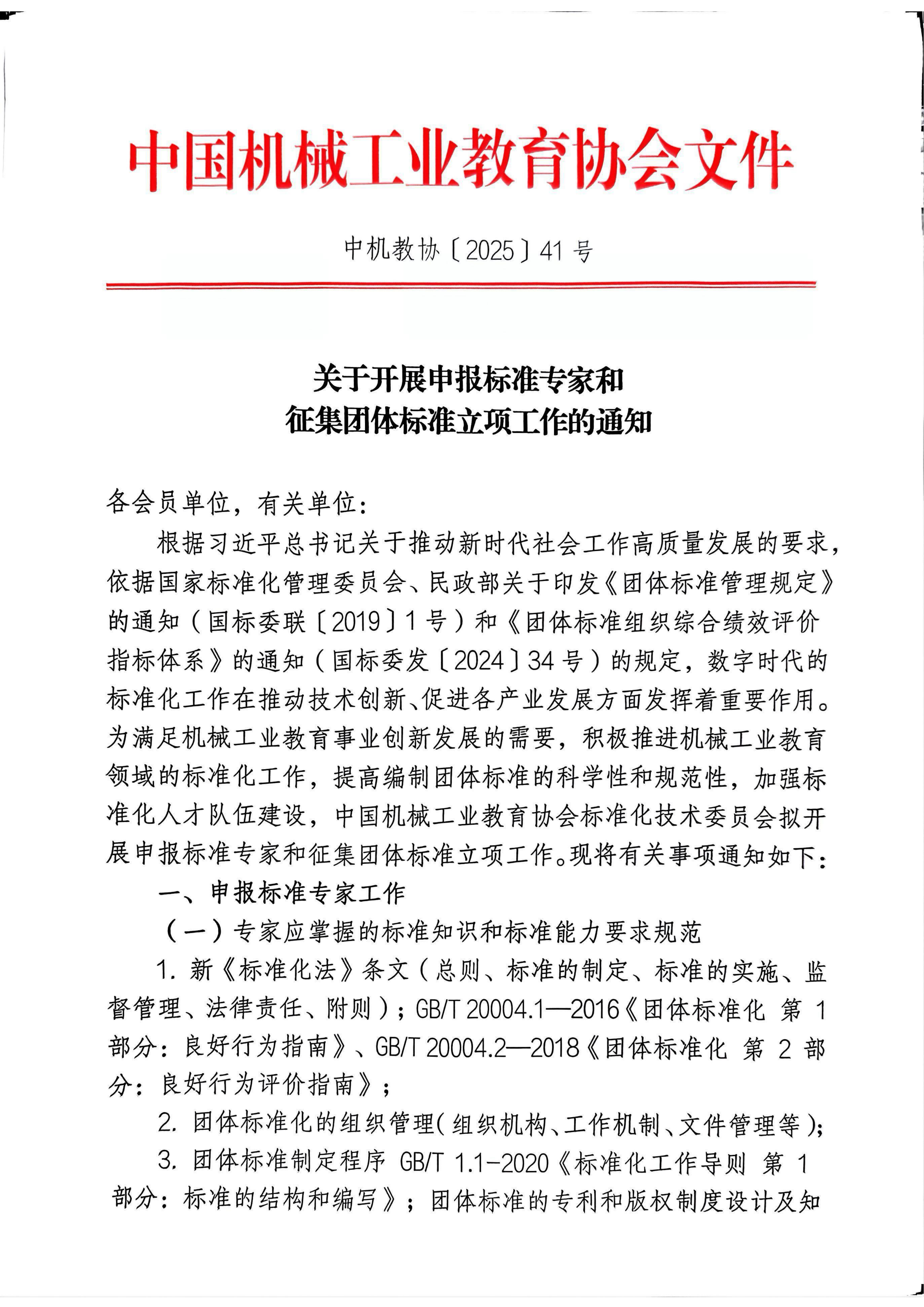 根据习近平总书记关于推动新时代社会工作高质量发展的要求,依据国家标准化管理委员会、民政部关于印发《团体标准管理规定》的通知(国标委联〔2019〕1号)和《团体标准组织综合绩效评价指标体系》的通知(国标委发〔2024〕34号)的规定,数字时代的标准化工作在推动技术创新、促进各产业发展方面发挥着重要作用。为满足机械工业教育事业创新发展的需要,积极推进机械工业教育领域的标准化工作,提高编制团体标准的科学性和规范性,加强标准化人才队伍建设,中国机械工业教育协会标准化技术委员会拟开展申报标准专家和征集团体标准立项工作。现将有关事项通知如下: